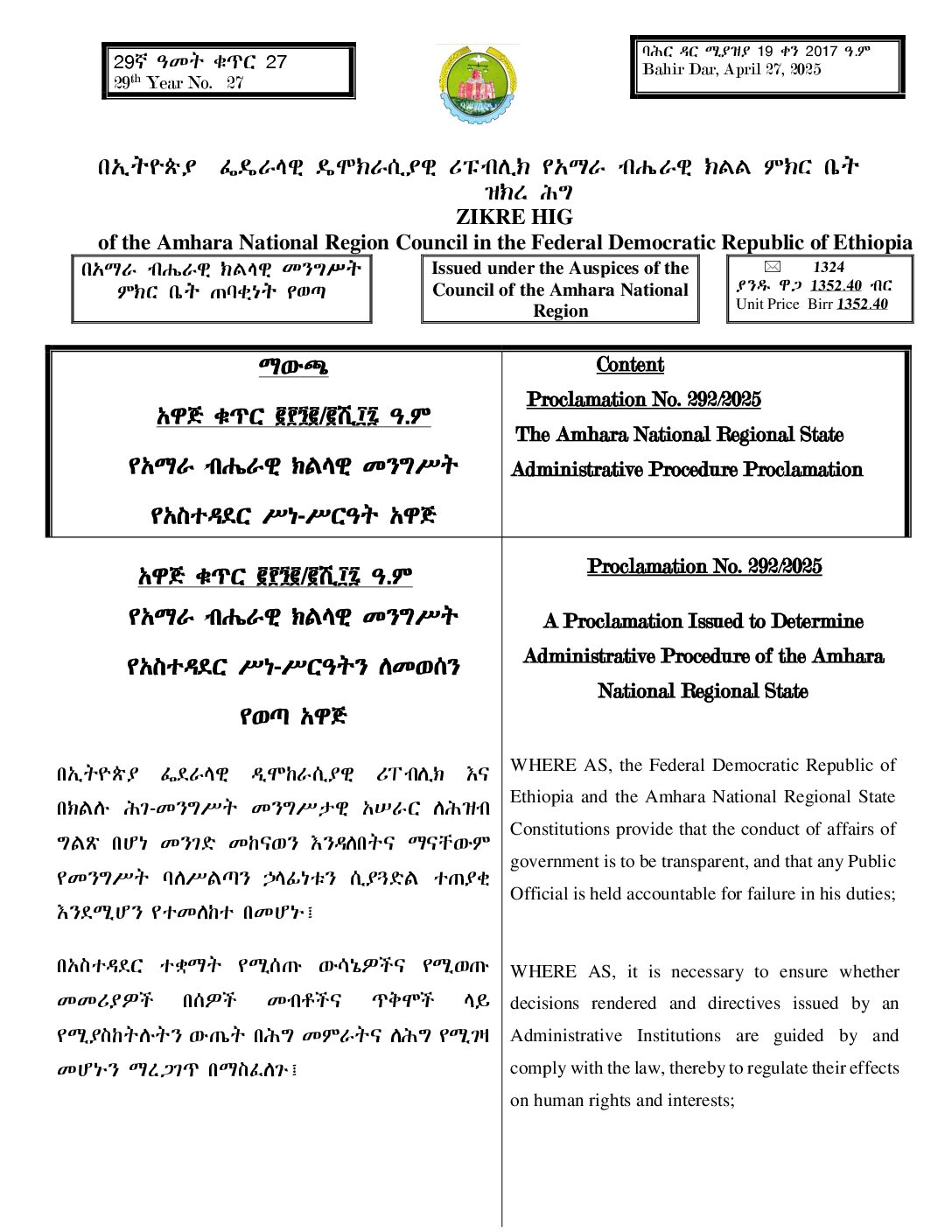የአማራ ብሔራዊ ክልላዊ መንግሥት የአስተዳደር ሥነ-ሥርዓት አዋጅ